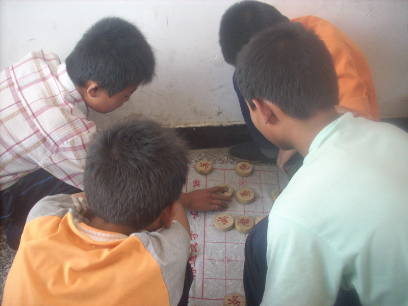 让我们先看看教室里吧,好几个同学正在为下象棋而争得面红耳赤。只听他们都争先恐后的说:“不能悔棋、不准耍赖”等。后又见他们熟练的把棋放回原处,并且嘴里还不停的唠叨着:“马走日,象走田,车行千里炮翻山。”还别说,这一套一套的真像童谣。再看看他们的身后,说得夸张点那真的是挤得水泄不通,一个个指手画脚的,好象一个军师在指挥作战一样。