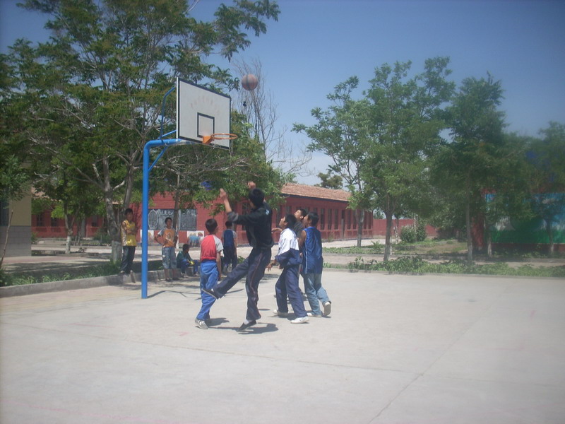 走出教室再看,篮球场上的同学们顶着烈日,头上冒着豆大的汗珠在打篮球。他们分成两组在进行篮球比赛,其中还有一个同学做裁判员。比赛才刚开始,就只听哨声时不时的响起,看裁判员的手势,一手指着中线,一手比划着,好像在指挥交通一样。旁边的男同学在帮我们做解释,听他说,不是什么走步了、两次了就是什么撞人了、骑线了等。这规则未免也太多了吧?可是这些都没有打消他们打对篮球的热爱,也没有影响他们的发挥。快看,其中的一个男同学他跨了三大步,单脚起跳,篮球从胯下一过,手把篮球往篮筐里一扣,哇,进了。大家都送给他热烈的掌声并且向他投去敬佩的目光。