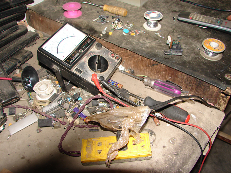 哇!这么多的修理工具,大到电仪表,小到电阻,不要小看这些小零件,它的用处可大了,用它们修理好的电视机,可以为很多农民家庭增添许多快乐的气氛。叔叔辛勤创业,终于用劳动的汗水换来了今天的好日子。