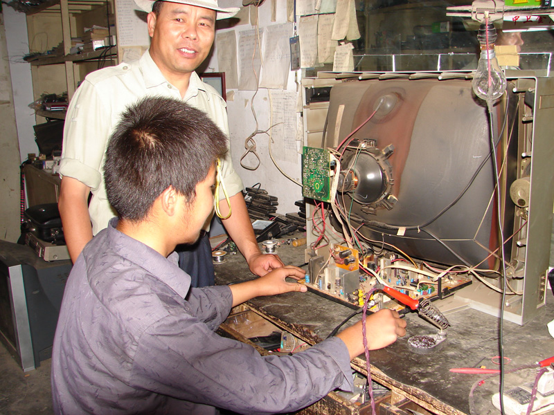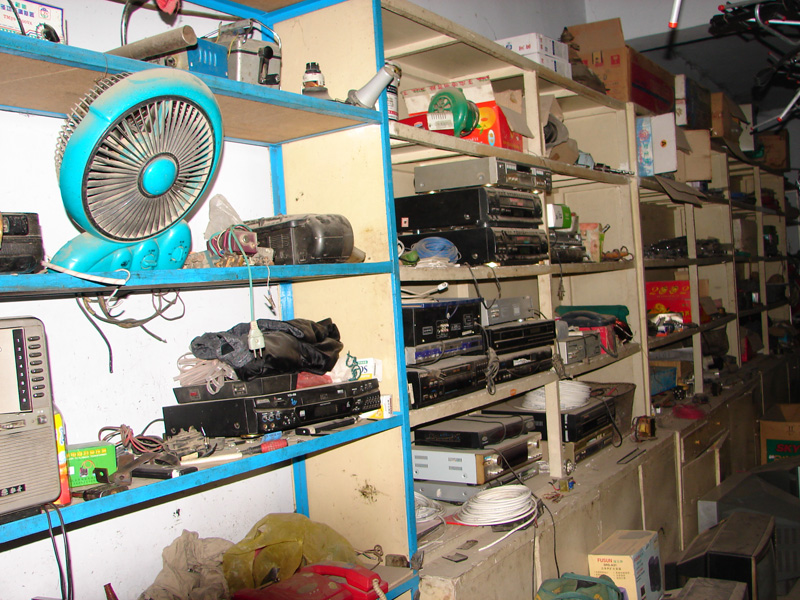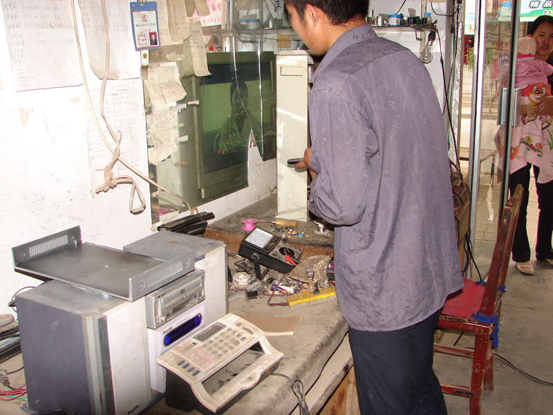这就是叔叔的修理库,你瞧!他都修理些电风扇、录音机、VCD、DVD,电视机、电饭锅……这些电器都是城市里淘汰下来的,我们农村人从城里低价买来的,虽然有些小毛病,但拿来让叔叔修好,也能让我们农村孩子看到外面的世界。只要是家用电器,他都会修理,并且修理这些都是小菜一碟,有的小毛病,不用他出手,他手下的徒弟就能把它摆平。