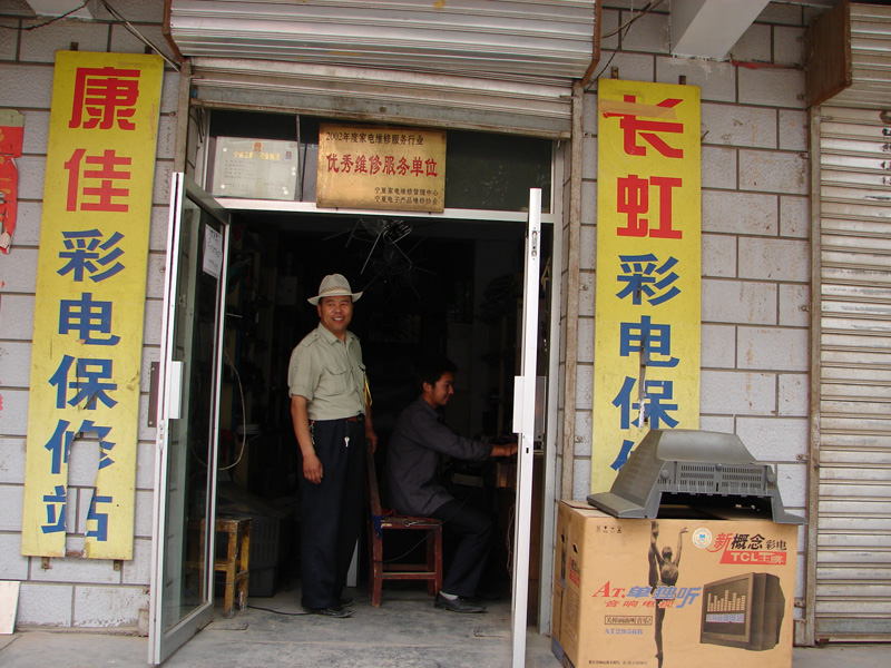 我叔叔的电器修理铺位于宣和南街。这是一个很普通的修理铺,但这是我们镇上的希望,十里八村的家电都会拿到这里来维修。看!这就是我叔叔的店面,他可是宣和有名的修理电器能手,他现在手下的徒弟好几名,我叔叔乐呵呵的,因为他早把本钱挣回来了。