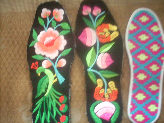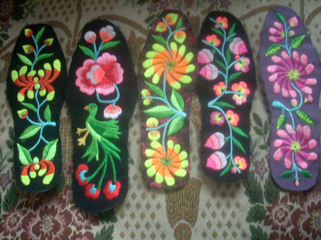 做花型的鞋垫,先要画好花,然后沿着所画的形状剪下来,再缝到鞋垫上,接下来的工作就是绣了,用各种各样的丝线按照所画的花来缝起来,然后开始缝边,加以修饰。