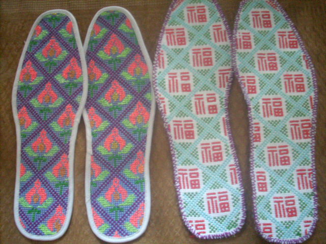 鞋垫分好几种,我知道的有两种:格子式的一种,花型的一种。要做格子鞋垫,首先要在白布上画好正方形格子,然后就根据自己的心思可以缝字、缝花,农家女心灵手巧:只有想不到的,没有缝不上的。格子鞋垫耐磨,很牢固,不易损坏。