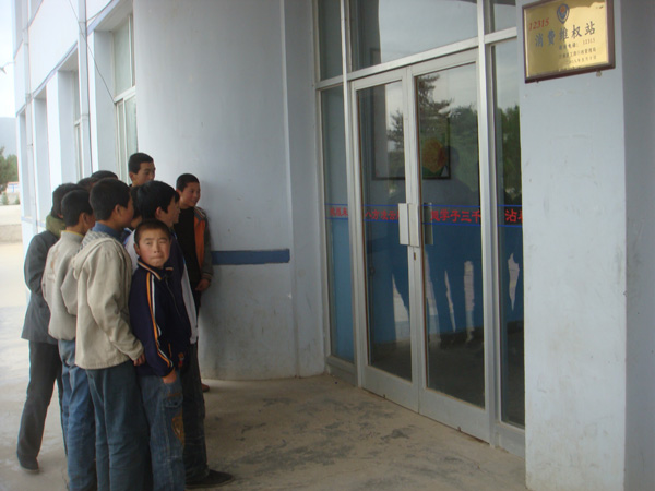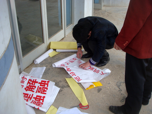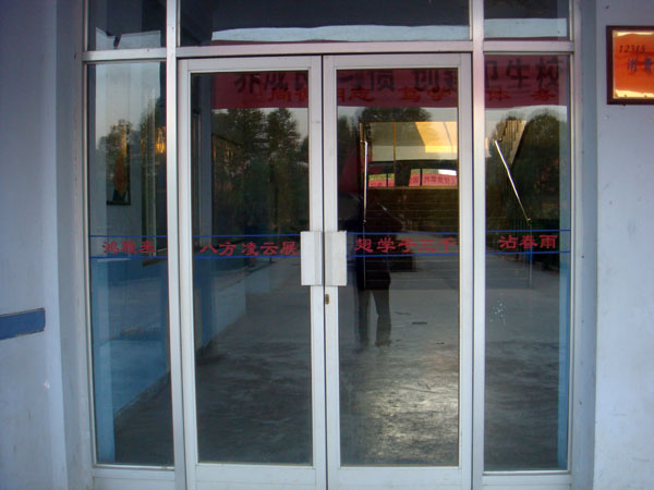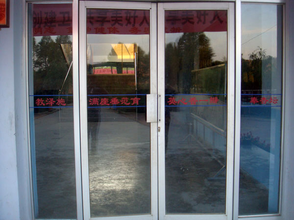 教学楼大门上帖字"鸿雁来八方 凌云展翅 学子三千沾春雨 ,教泽施满座 垂范育英 心香一瓣奉杏坛","一代园丁乐,四时桃李荣","知书以达理,读史以明智", 意思是我们学生、老师共同努力,实现自己的价值。