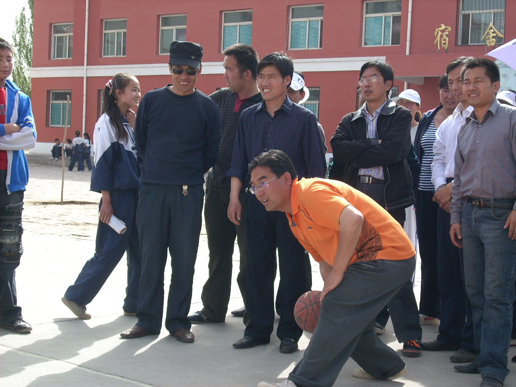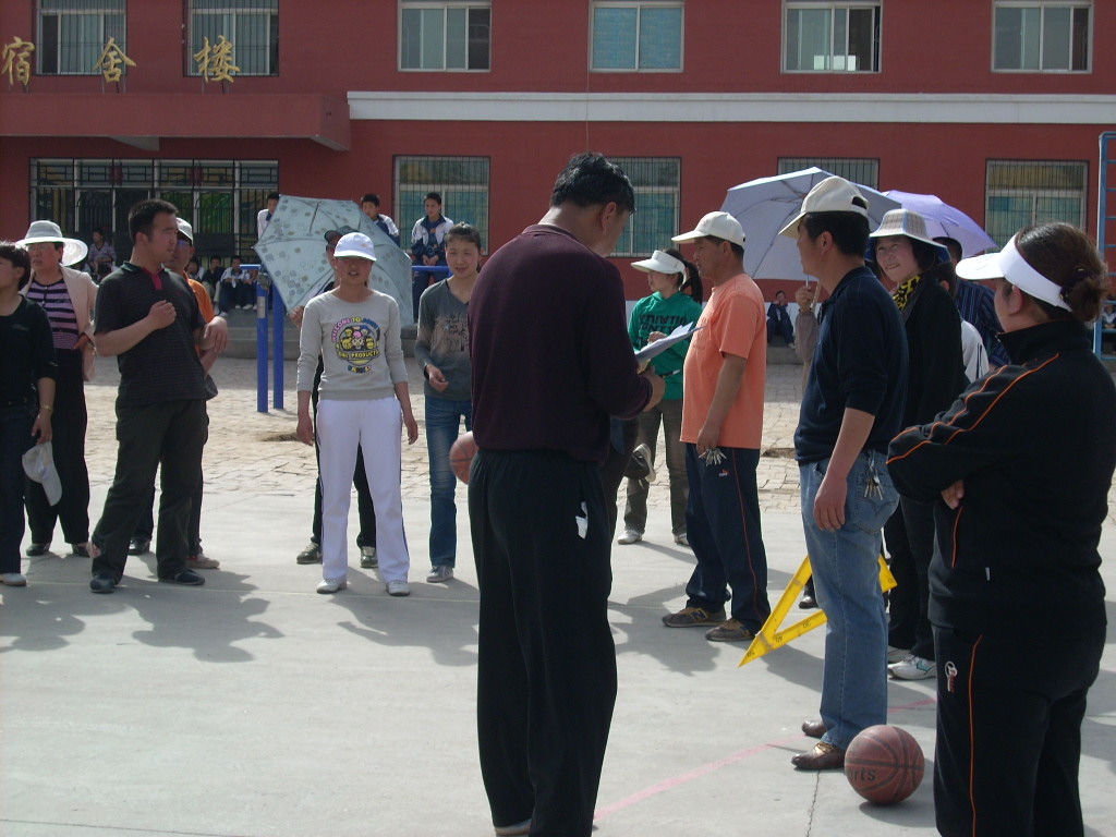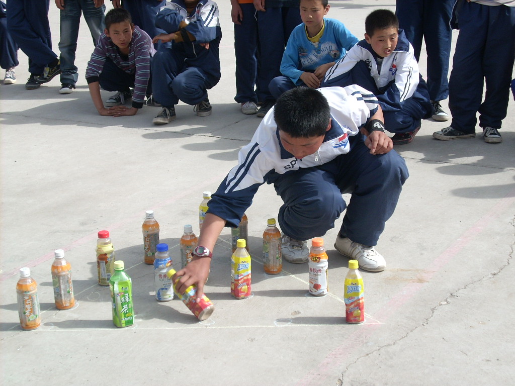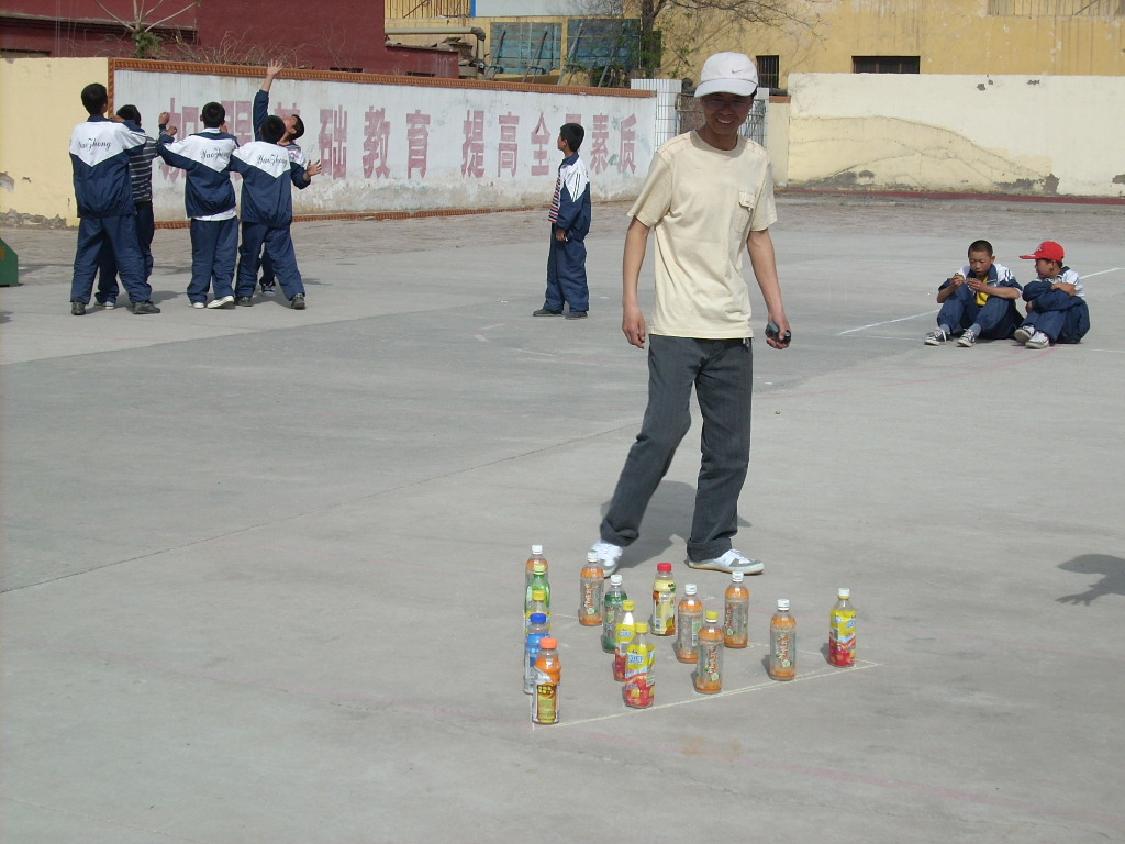 我们学校属于农村中学,受农村条件限制,保龄球比赛场地就是篮球场,"保龄球"是装有沙子的饮料瓶,"保龄球"摆放好了,呈正三角形,站在旁边的是摆放"保龄球"的教师。