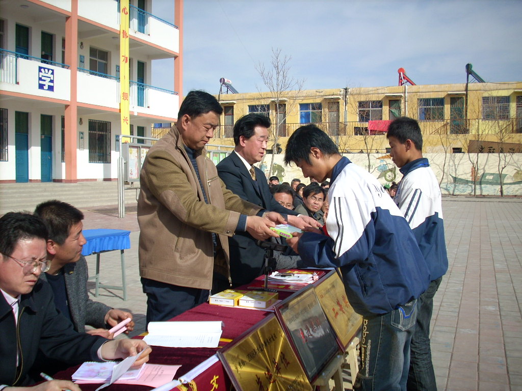 为了表扬学习成绩优异的学生,学校专门拿出一部分资金作为奖励,给这些学生买了学习用的笔记本、文具盒、电子词典等奖品,两位校长正在给优秀学生发奖,得奖的学生双手接过了奖品,他们心里一定有说不出的高兴:学习是为了自己的未来会更好,想不到学校还给我们发奖品,我们真高兴。