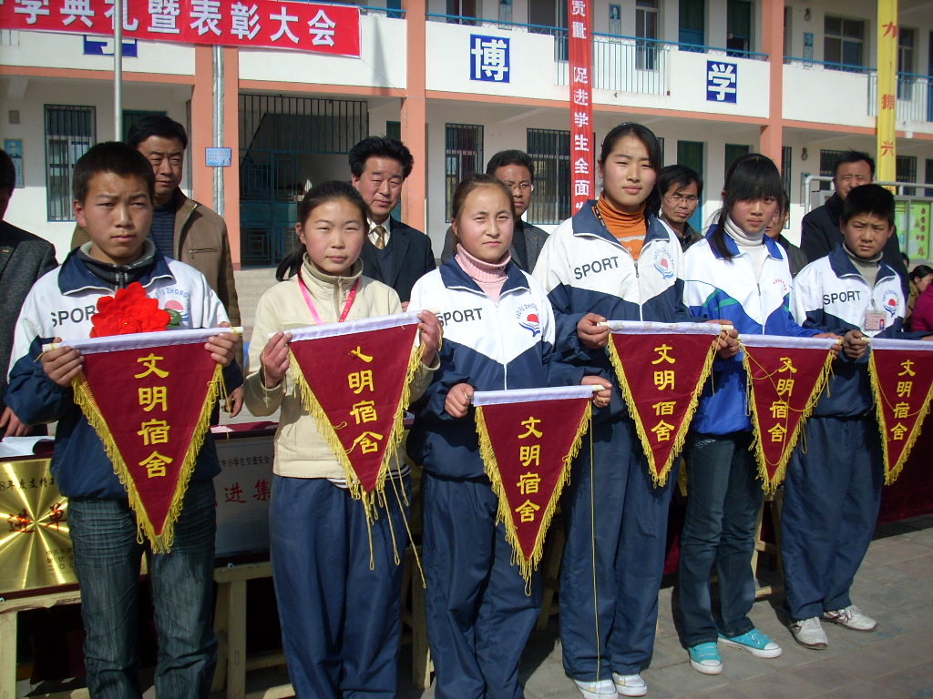 在本次开学典礼上,学校还对上学期的文明宿舍颁发了锦旗。学校经过检查考核,评选了六个文明宿舍,也就是每个楼层评选两个文明宿舍,这六个文明宿舍的舍长代表宿舍领取了锦旗,本学期,他们会做得更加好。