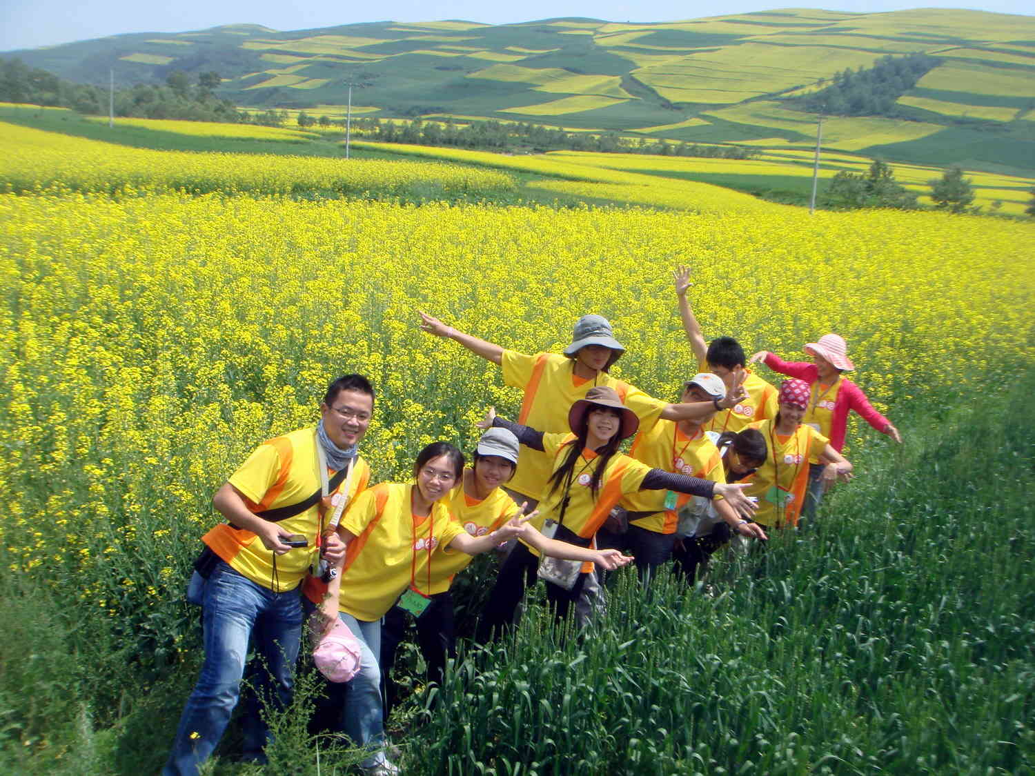 一个声音传来,到青海的西宁啦,呀!一下子,全车睡意矇眬的队员全睁开了眼,整个车子又开始沸腾起来,看风景的看风景,有疑问的就开始问这问那,第一次登上海拔2000多米的地方,还好,没有什么高原反应,一切都正常,在车子的颠簸下,过了半个小时到达了大通县,下了高速公路,走上柏油马路,又经过约半小时的时间到达了城关镇,好吧,"大家肚子饿了",下车吃饭,吃了羊肉、牛肉,一人一个炮仗面,吃饱了喝足了水,坐车向学校行驶,在路上,遇到风景优美的地方,停下车进行合影留念,景色真是迷人极了,油菜花发出的香味,吸引了来客,不错,真是美极了。