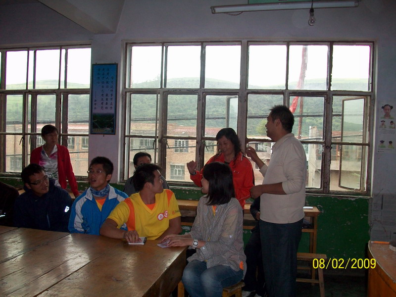 2009年8月2日台湾伊甸基金会第三梯队12:10分到达青海西宁,紧接着,就上了到学校的车,车走到大通县铝业公司时,天下起了小雨,过了大通县县城,看到了老爷山、牦牛山,也看到了娘娘山。车行到良教,突然又下起了大雨,没关系,好在,人都在车里,没有淋着,等到了城关镇下车到延庆饭馆吃饭,一时温度就下降了好几度,下车时要穿外套了,经过了一番周折,总算填饱肚子,好了该去学校了。