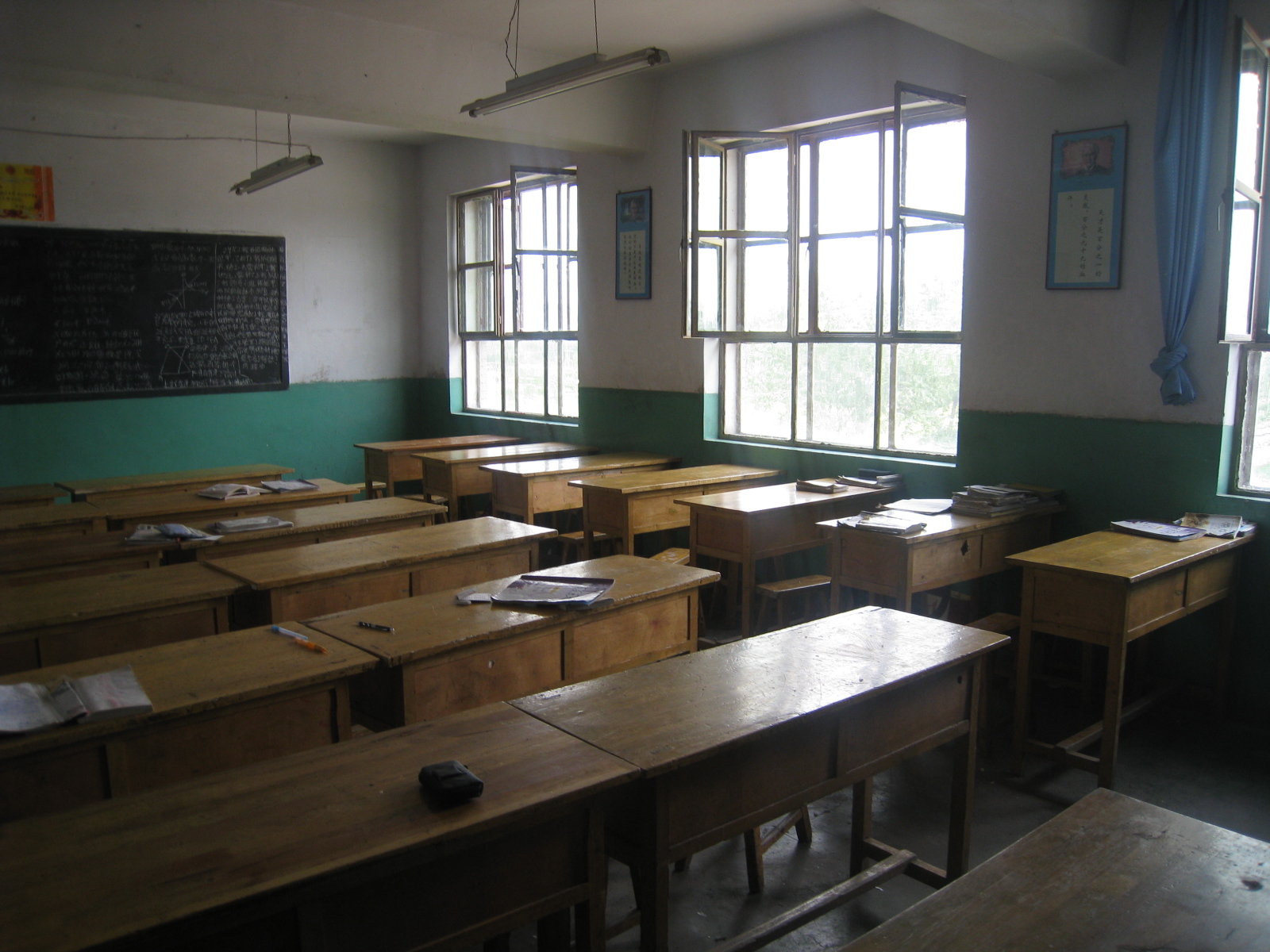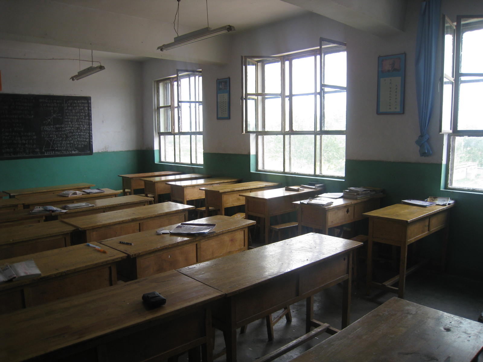 我们的教室和其他班的没什么区别。有三间房那么大,所以在教室里有三个窗户。平时课间休息时间我们就趴在窗户上望着外面的风景。在教室里还有六盏日光灯,当天气很阴里面的光线不太好的时候我们就打开它。