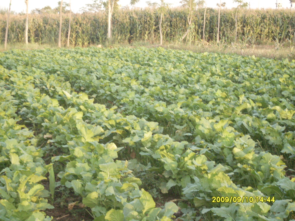 这是奶奶家的白菜地,一片绿油油的,白菜的叶子很大根很小一拔就可以拔出来。这块地先种过麦子,然后又种上了白菜。