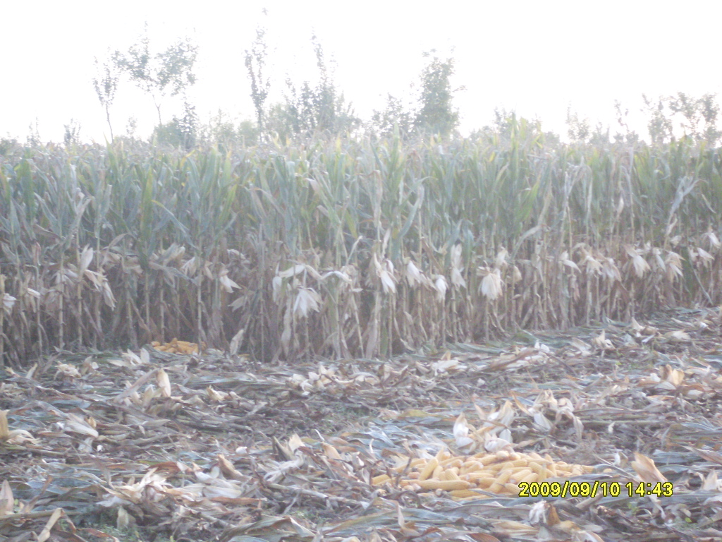 这是一片玉米地,图中有没有砍到的玉米,还有砍倒剥开的玉米,玉米以后可以卖钱,玉米杆子以后用来喂牛,喂羊。