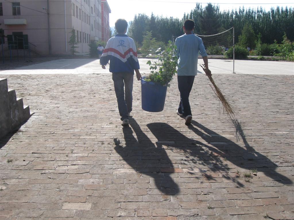 下午,天气很晴朗,同学们自带了工具到操场集合。学校分配了卫生区域,我们的是足球场的杂草清理工作,还有一块"责任田"。此时,太阳已经火辣辣地烤着大地,地面上的温度骤然升高了。开始行动了,老师和我们一起拔草,边做着,边说着笑着,不一会儿,每个人的额头上渗出了汗珠,只见他们抬起胳膊往额头上一挥,继续干起来。也许是因为我们都是农村的孩子,不怕吃苦,更是因为我们知道这是最后的一次集体劳动,都特别珍惜。