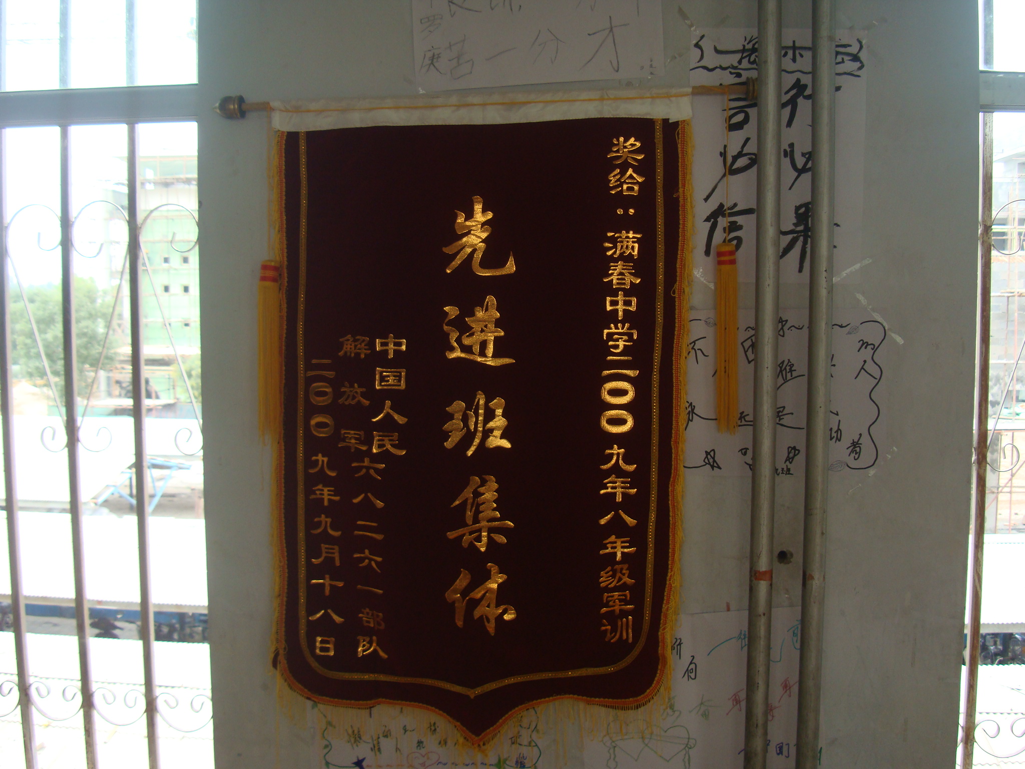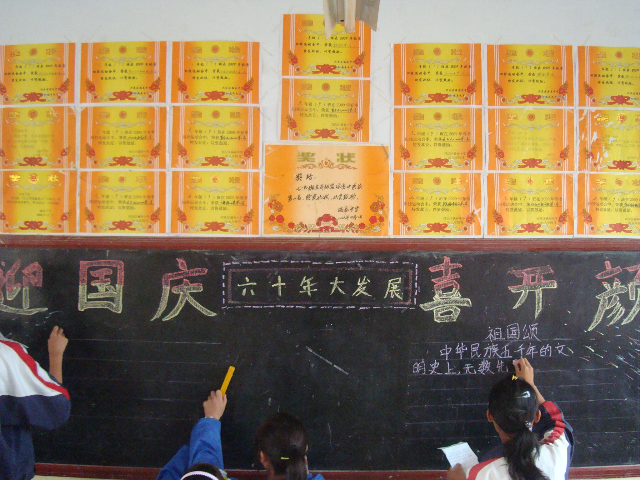 八(9)班不仅是荣誉班集体,还是体育特长班。也许因为班主任是体育老师的缘故,我们在运动会上的表现更胜其他班一筹。你瞧,后面墙上贴的奖状,女子4×100米接力赛第二名;男子4×100米接力赛第一名,50米迎面接力第一名……一张张奖状像一个个驱动力促使我们不断向前去。因为奖状是荣誉,因为奖状是光荣,因为奖状是我们班的象征。