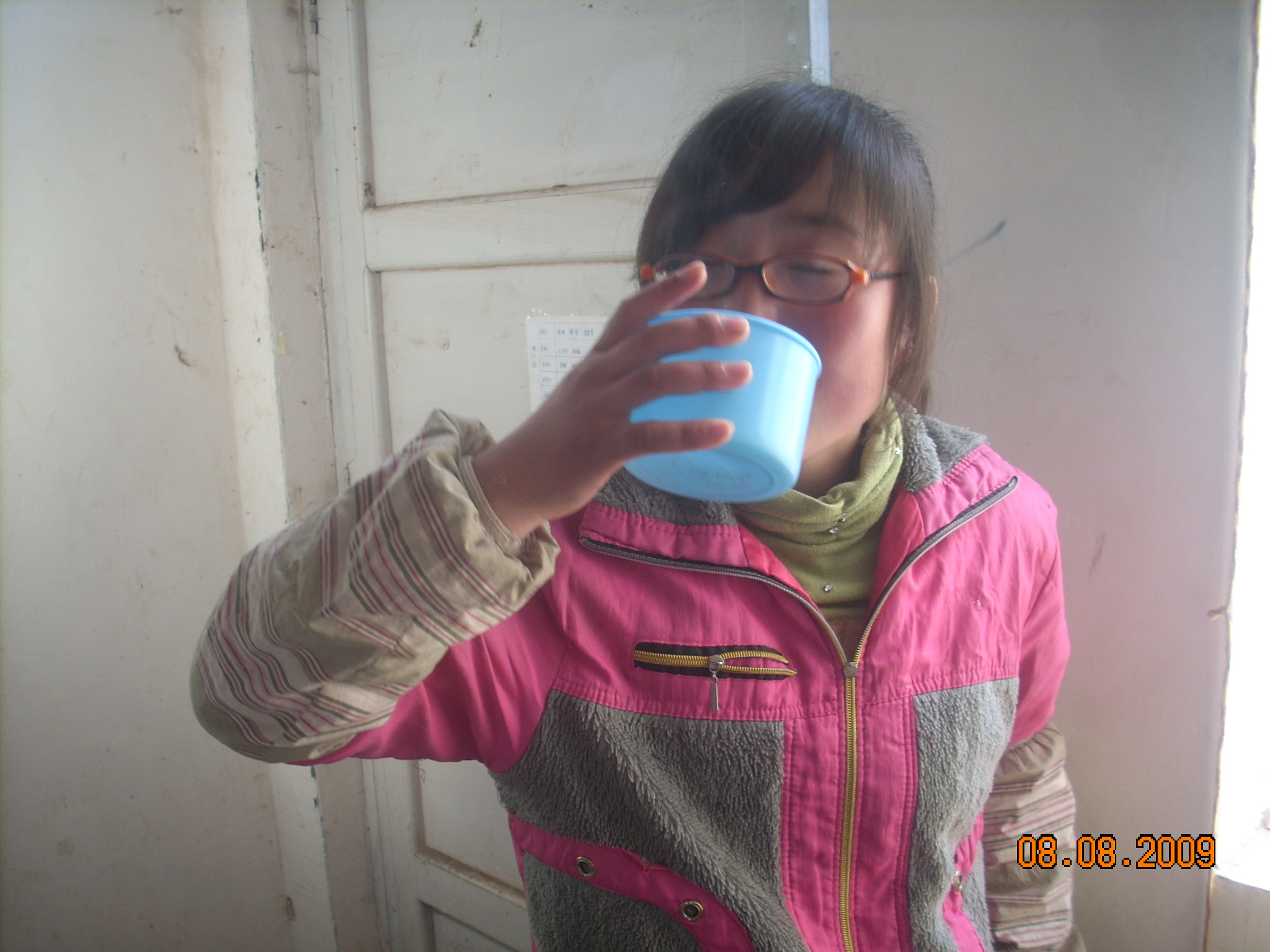 每天中午,别的同学都去宿舍吃午饭了,而她却没有,她的午餐特别的简单,一个馒头,,一瓶水.但是,她从来没有抱怨过生活的苦楚,在她看来这是学习生涯必须走的路,因为她认为;只有经历风雨,才能见彩虹.这是她的座右铭.瞧,她喝水的样子多可爱啊!眼睛都眯成一条缝了.