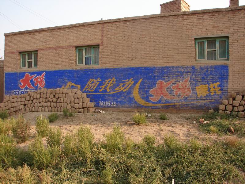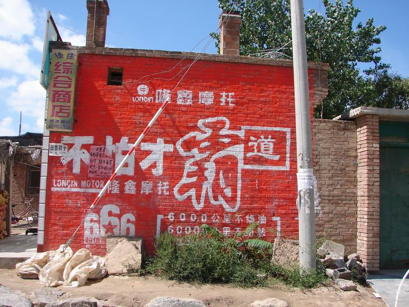 这是我们村的村民自己开得综合商店,"霸道"摩托销售公司想的的确很周到,选择人比较集中的、环境较好的场所宣传,而且选用刺眼的红色来吸引人们的眼球。不过这倒好,这么大幅的广告为这家的外墙做了一次粉刷,好像也是值得的。