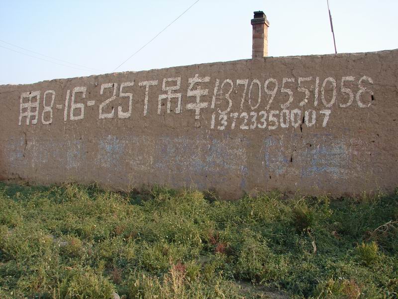 嘿,嘿!连这家的土墙也不放过,这个吊车公司可真能选地方,真会利用资源啊!