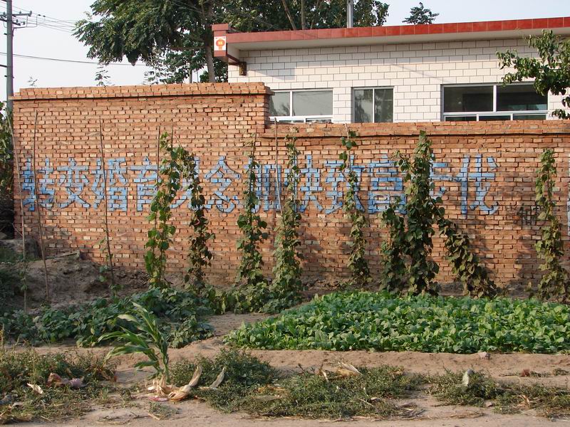 像这家墙上的标语:"转变婚育观念,加快致富步伐",很明显是我们某个村委会写上去的,主要目的就是提醒人们要优生优育,响应国家的计划生育政策。这倒还挺有意义的,最起码可以让路边的人感到这里的人口素质比较高,这个村的计划生育工作抓得很好。