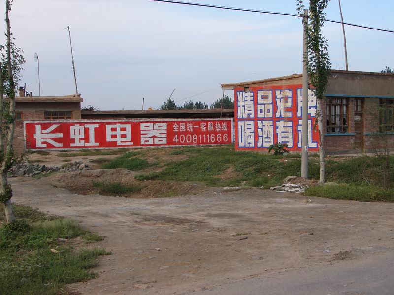 长虹电器选择了这家的围墙,同样用鲜艳的红色,六米多长的距离都被它霸占了。沱牌酒也不逊色,它占有的长度没有长虹电器的长,但是比较高,选用白色字迹加蓝色边框来装饰自己。这两个宣传广告在一起,但愿不要打架呀,否则我们可不能相劝啊。