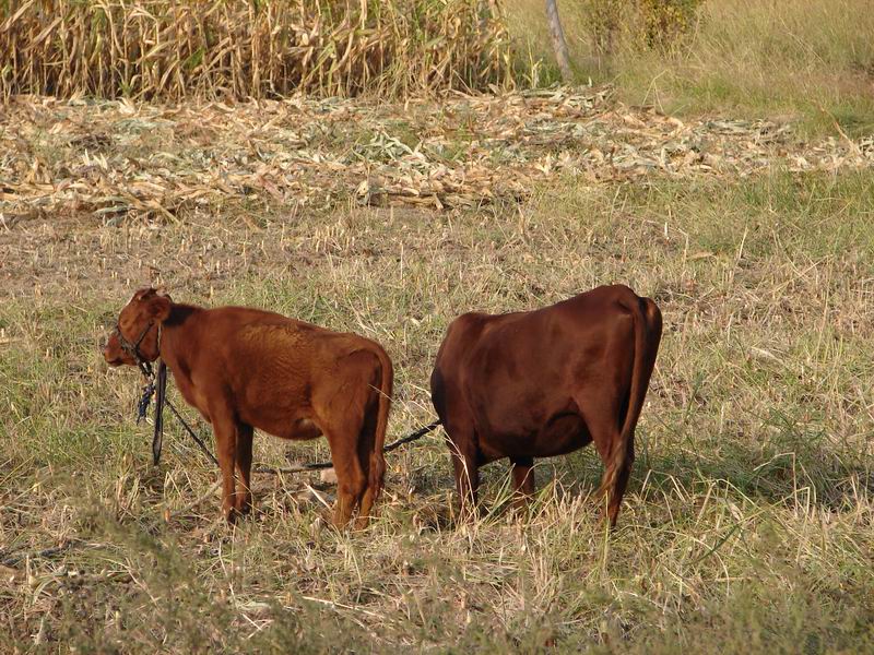 不止羊可以吃玉米的落叶,牛也不甘落后。养牛的主人可是苦心经营着自己的爱宝,也将牛拴在田里一个固定的,草多的或者落叶多的地方去慢慢享用。牛天生就是喜欢沉思的动物,要是你注意观察过,你在吃草时会留下眼泪。这两头牛中,左边的可是望着远方更好的地方,也许它不喜欢这个处所,可是主人不让它去,只好默默的发呆。右边的这头牛可是认真的吃着自己周围可以吃得东西,先填饱自己的肚皮再说吧。