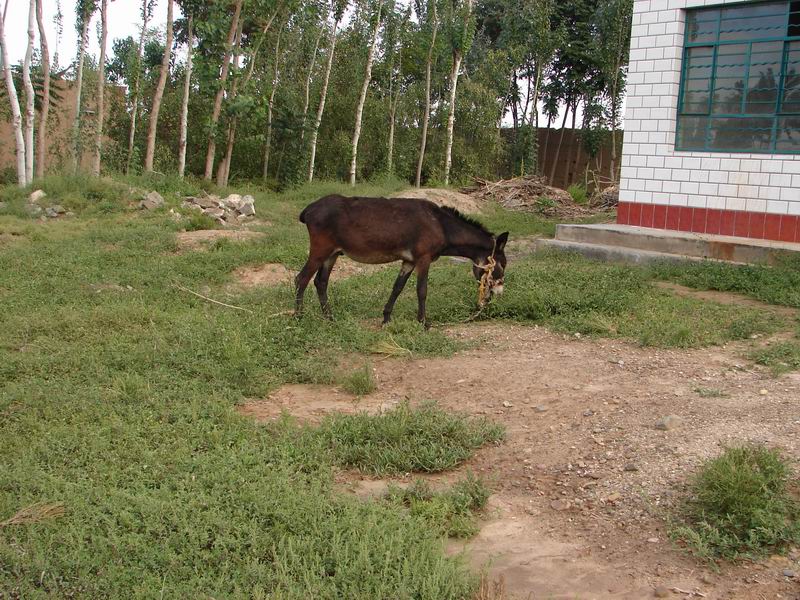 看看这头驴吧,吃得可是膘肥马壮的,身上的毛黝黑发亮啊!主人将它放开院门前边,周围有嫩草相伴,满地的绿色可是它最喜欢的,于是埋头大吃起来,连我给它拍靓照都没有发现。