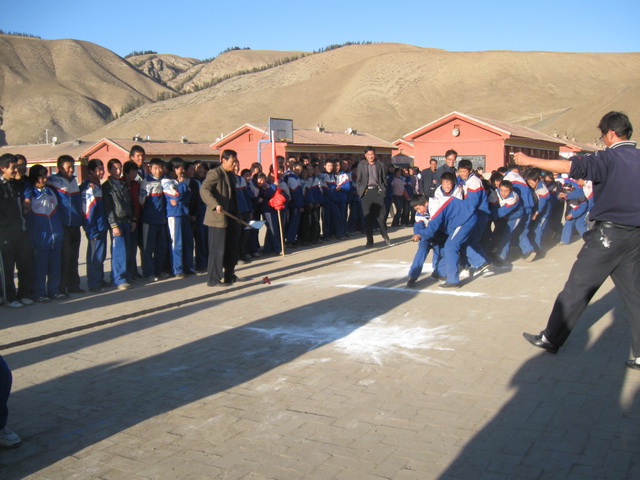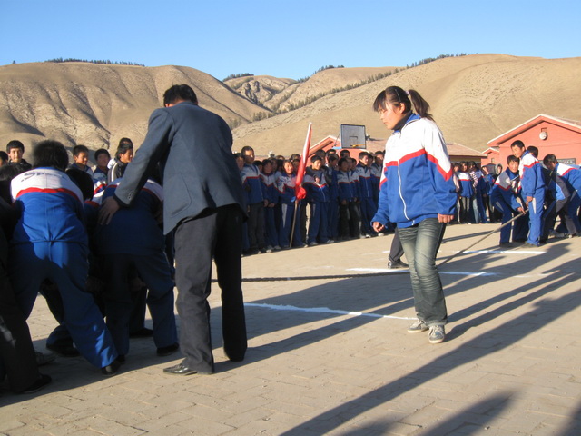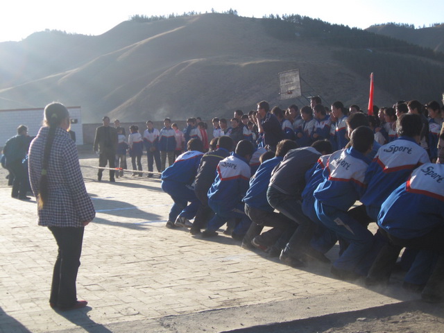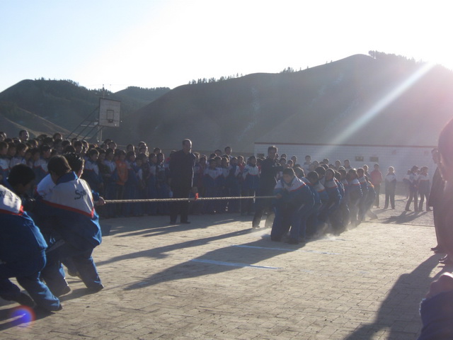 夕阳把余晖洒落在操场上,使操场染上了一片金黄。这里正在举行的是我们初二(3)班和初二(1)班的拔河比赛,参加比赛的同学个个精神振奋,斗志昂扬。