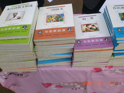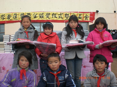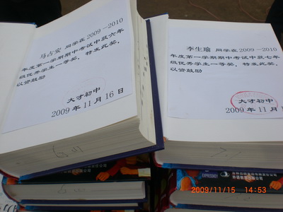 这次期中考试的奖励资金由台湾花莲飞扬少年成长中心提供,奖励分一等奖和二等奖,五年级一等奖品是:汉语字典一本地区(32元)、名箸一本(10元)、书包一个(23元)。六年级和七年级一等奖奖品:英语字典一本,名箸一本,书包一个。八年级一等奖奖品:尖子生案三本(语文、数学、物理),名箸一本,书包一个。