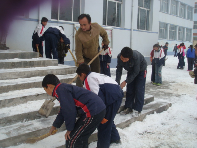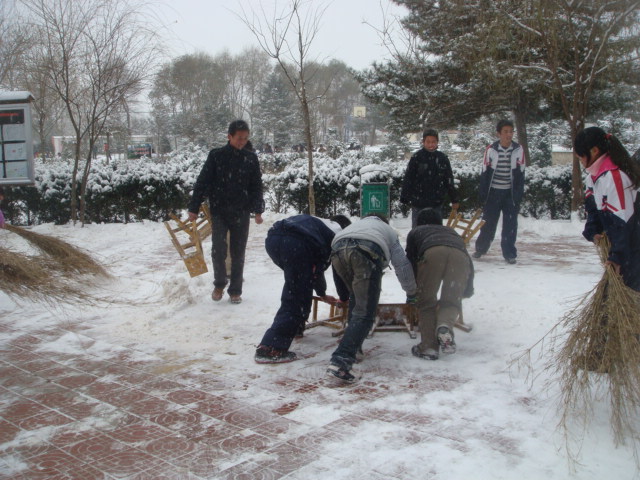 同学们都没想到今年的第一场雪,竟然是这样来的突然与猛烈,我们一边劳动铲雪,一边体会到在雪中干活,给别人带来的方便。当大雪没有清除的时候,不停的有学生摔倒,大家那种快乐感,随之渐渐在消失。