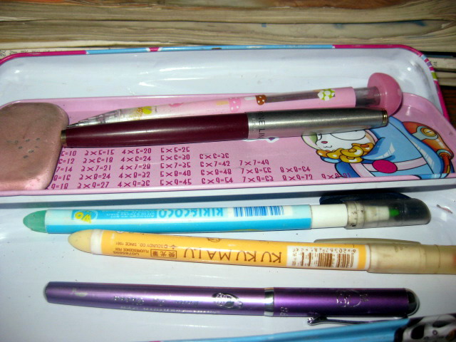 文具盒分为两层,第一层装着我的橡皮和一支自动笔,钢笔。第二层里装着我的两支水彩笔。