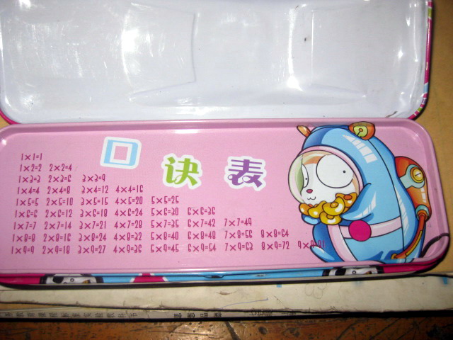 打开文具盒,里面第一层上印着九九乘法表,还画了一只天蓝色的宇航鼠。抱着很多金元宝。好像在说:"朋友,你只要背会了乘法口诀,我就把这些金元宝给你。"我还觉得它像是在讽刺我一样,因为它有很多元宝,而我没有。就这样,它使我很嫉妒。我便认真的背,一天一周一个月。我背会了,而且背的滚瓜烂熟,在学习上一点也不马虎。