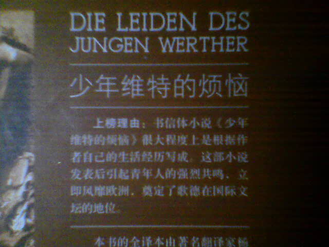《少年维特的烦恼》是德国作家歌德所著的书信体小说,描写了少年维特爱上已同别人订婚的少女绿蒂,,却无法与其在一起,使得他陷入毫无希望 的爱情的痛苦之中,以致