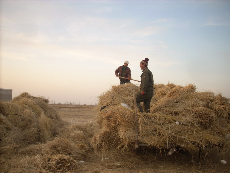 那么这些草又是从哪里来的呢?原来,还有几个人开着板车,从田里辛辛苦苦的把稻草往上运,可是最后还得一个一个往下扔······