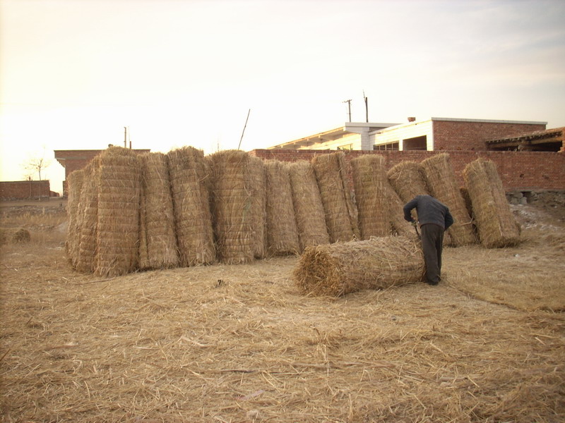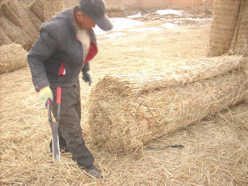 你们肯定以为,这样就算完成了一个完整的草帘.并不是,因为卷好的草帘的两头出现参差不齐的干草枝。为了美观,实用。还要修剪两边的干草枝。这不,还有一个人手里提着一把剪刀,像修剪花草似的修剪着干草枝,这样才算一个真正的完整的草帘。然后把它们竖起来放得整整齐齐的,从远处看很美观 。