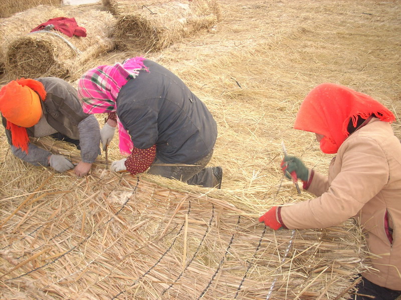 当然,入草的另一头出来的就是一张草帘。有两个人在那儿收草帘,并且按规定的米数进行裁剪。裁剪后还要勾线头。看他们的动作,就好像在编制着什么似的。用线头从帘底穿过来,然后再绕个圈,把线穿进去在用勾针勾出来。就这样,一直把整个宽度都勾完。然后再把草帘卷起来。