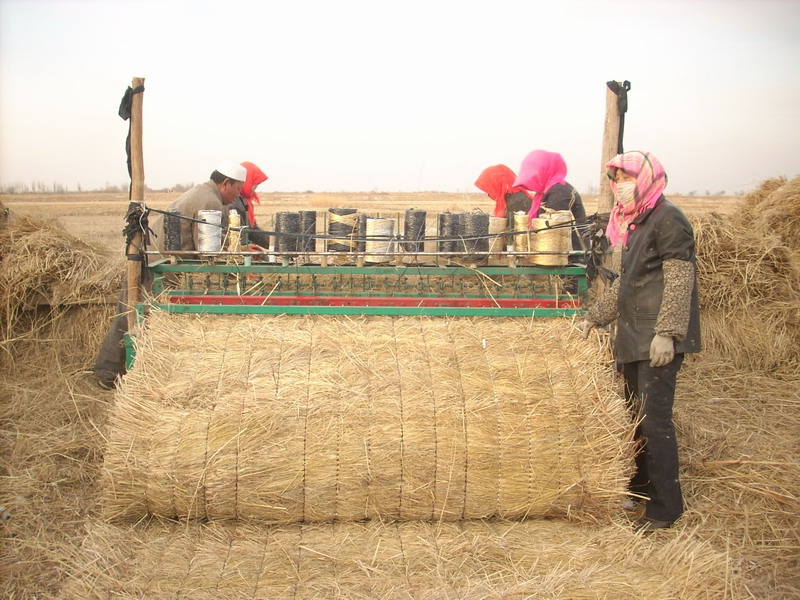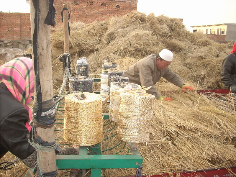 他们每天很早起来准备吃的等到孩子们都去上学,他们把屋子都收拾好就去开工了。一大早,就会听到隆隆的机器声。他们分工的很合理。有四个人入帘子,两边各站两个。看他们的动作,好娴熟啊。用手拿一捆草,整整齐齐均匀的撒到上面,并且双方合作的真是天衣无缝。中间完全看不到有漏洞或者缝隙。如果机器不停地话,他们的动作就不能慢,必须要赶上机器的节奏。他们这中间不但不能停歇,而且动作还不能慢。可想而知,他们真的很辛苦。