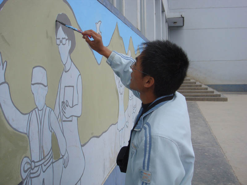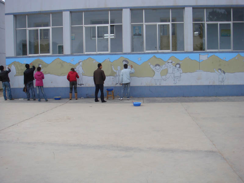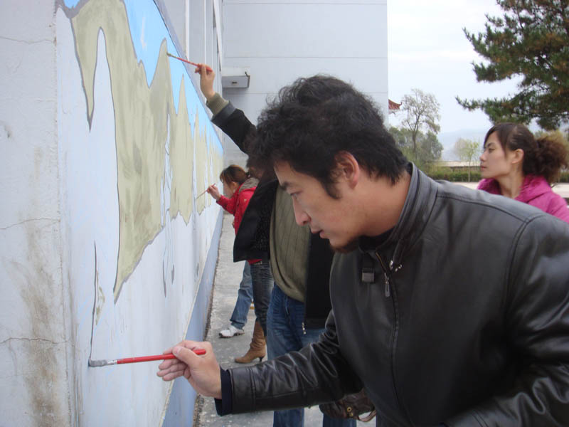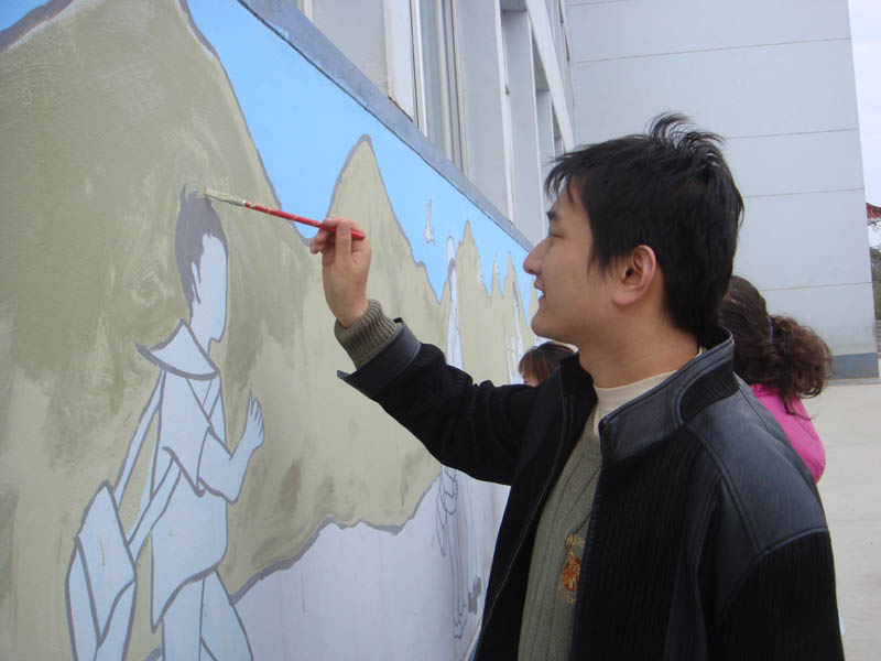 人在走,季节在更替,然而人的感情是真挚的,冒老师和朱老师他们虽然又一次走进了大学校园,但是他们依然怀念着在二中支教的生活,他们又一次加入了我们的集体,用自己的双手绘制了他们心中美丽的图案.随着自然的循环,一切尽在不言中.校园的生活丰富多彩,点滴的生活小事,值得感恩的动人故事,一路行走的见证都频频出现在墙壁上.伴着蓝天的拥抱,嗅着花香,草绿的气息,随着绿色生命的蔓延,翻开新的一页生活,在我们的画笔中脱颖而出,每一个图案都是生活的感悟.