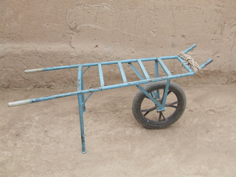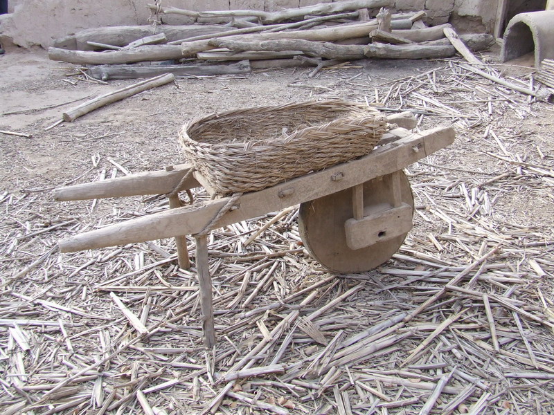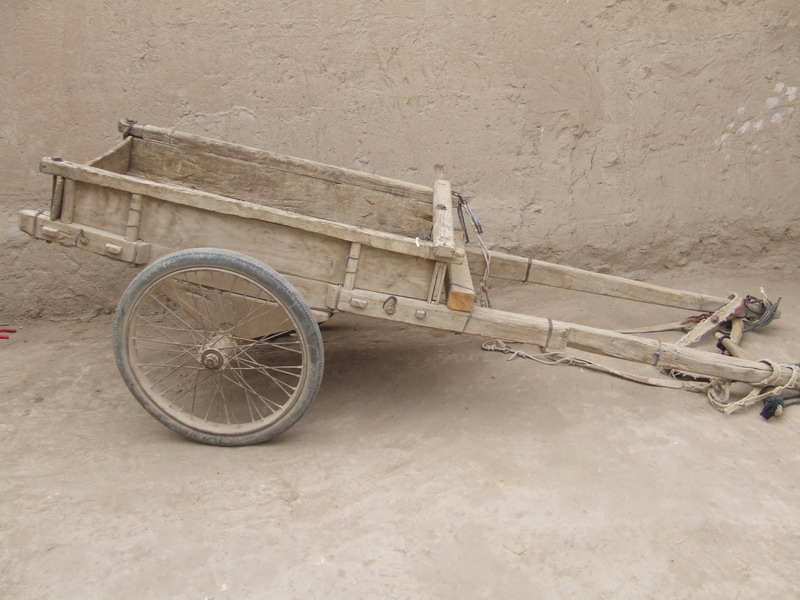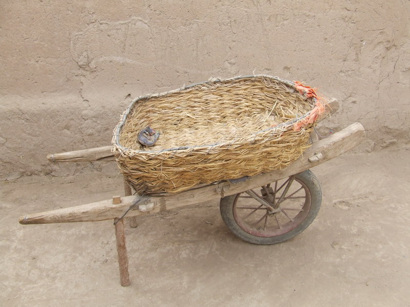 推车又名独轮车,也是我们这里过去家庭主要的运输工具,它的车身除了车轴以外,全是用木头制作的,然后将用芨芨编织成的筐用铁丝或者绳子捆绑在木排上,就是图中你看到的样子,当然也可以根据需要将筐取下。其特点是轻巧灵便,具有其它运输工具不可替代的优点,主要用于在一些比较狭小的地方推土等。