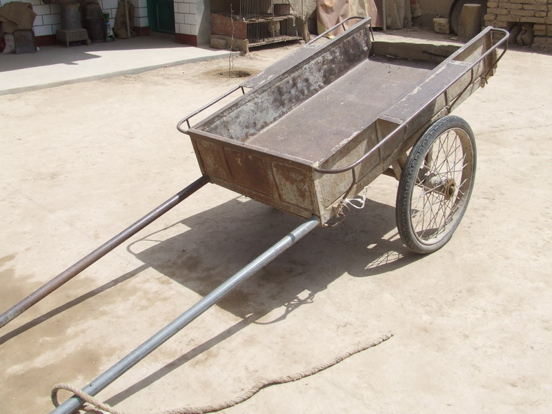 架子车是我们这里常见的运输工具之一,前些年这里拉粮食、拉水、拉土等全靠它了,车身除了车轮车轴外,还有辕条上的铁环以外,其它的车身部件都是自己动手或请木匠做的,以前这种车的车辕是木头的,但后来逐渐变成了钢管。车箱也逐渐由木头变成了铁板、铁皮,人拉起来很费力。