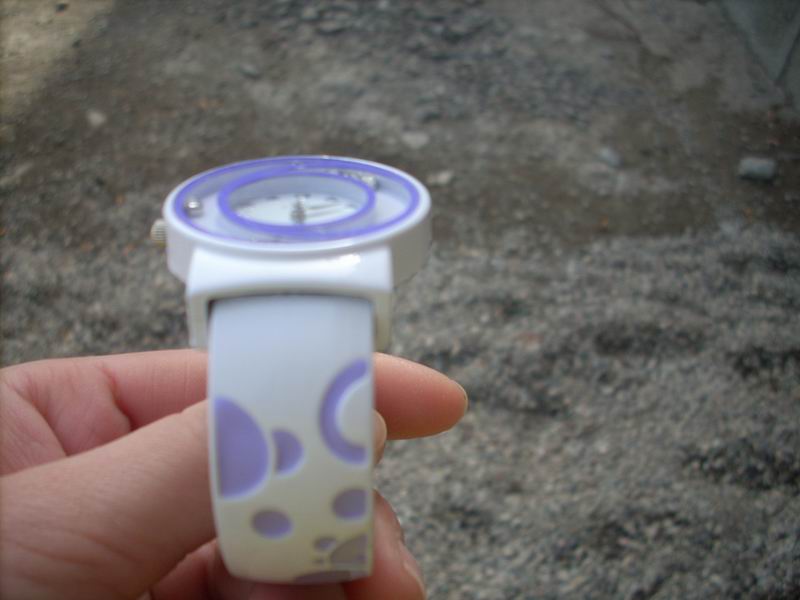 这是一块白色的手表,上面有紫色的花纹,很美,表的两边是相互对称的,花纹也是相互对称的,表的中间呈圆形,两边是用紫色线条做的两个月亮,月亮里有着六颗小水砖,一闪一闪的,特漂亮。