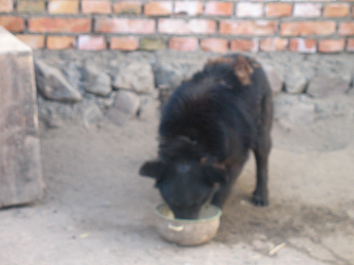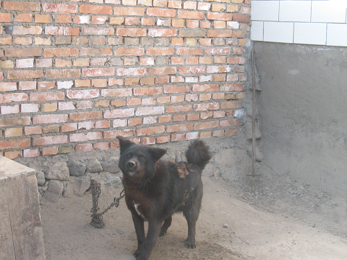 那是一只黑颜色的狗,据说是姨父从玉树买来的。它比一般的狗要机警,敏锐,假如扔过去东西,一般的狗也就是离自己较近的才能用嘴吊住或眼光随着食物转,但姨父家的这只小黑狗却很厉害,只要是在它的"势力"范围内,它就可以准确无误地接住。而且如果你扔一只死了的小鸡给别人家的狗,他们肯定会吃,但姨父家的小黑狗是一定不会吃的,它只吃自己杀死的猎物。怎么样,这只狗有个性吧。