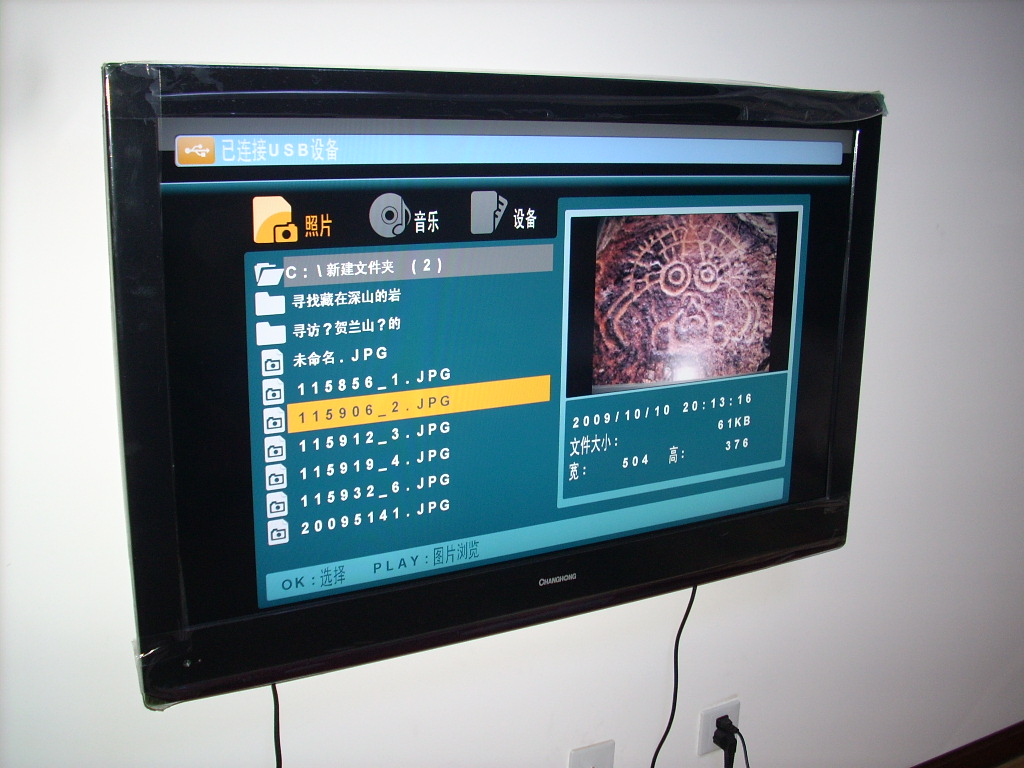 这是最近几年出现的大屏幕液晶电视机,这种电视机功能强大,可以和移动存储器连接,播放里面存储的电影、图片,还可以和电脑连接。我们学校网页大赛小组拍摄的贺兰山岩画图片保存在优盘里,将优盘插在电视机的优盘接口上,进行输出转换后,就可以在这台液晶电视上观看了。