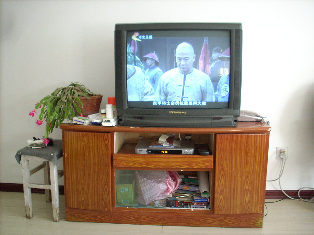 这是我老师家的29吋彩色电视机,这种电视机是显像管式的,体积显得很大,而且重量不轻,有一百多斤,可是,它是液晶电视机出现之前的佼佼者,所以,现在许多家庭还在使用这种电视机,瞧,电视里正在播放《铁嘴铜牙纪晓岚(第四部)》这部电视剧呢。