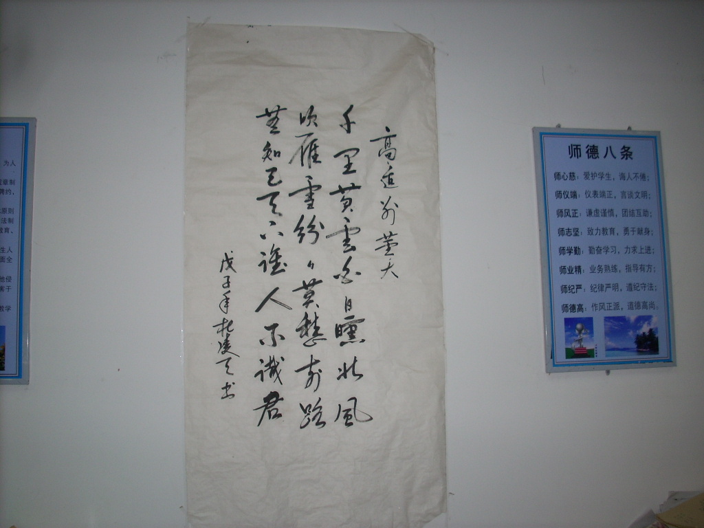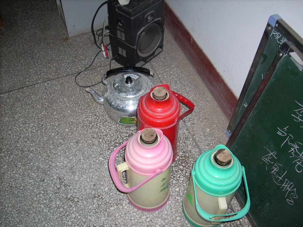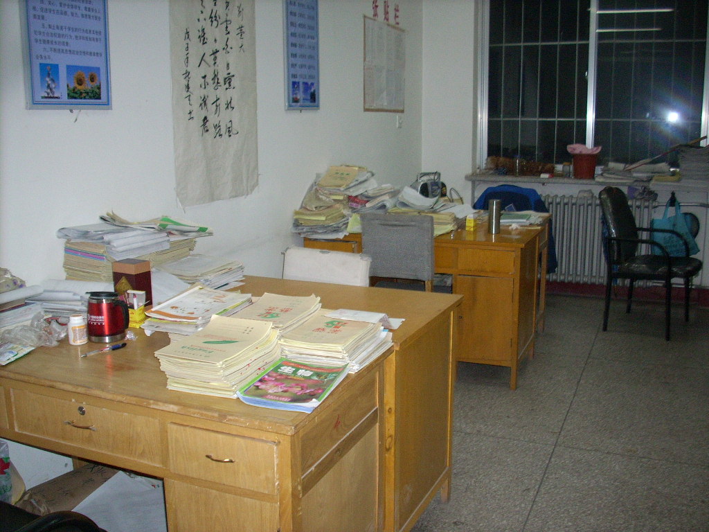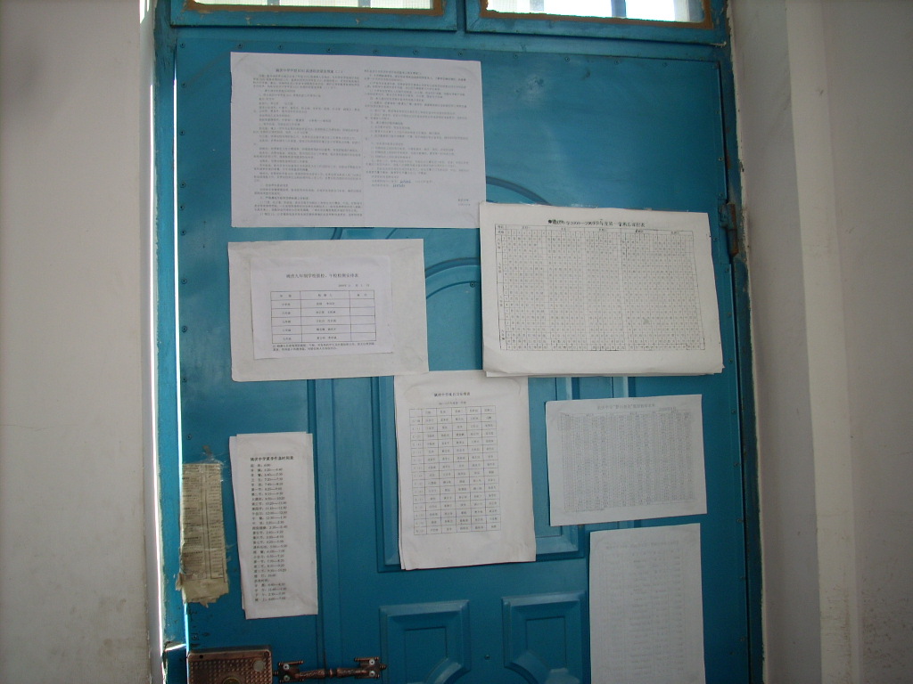 我们年级组的办公室由于墙上装饰一新,所以,张贴栏就在门后面了,门后面贴有了课程表、时间表、晚自习安排表、值班表等,虽然有些乱,但对老师很实用。 我们尽管现在用上了新教学楼,可教师的办公条件还是较差的。最大的弊病是教学楼上没有通自来水,我们的老师在办公室里喝水很不方面,值日老师要提着热水瓶到有水的地方把水接上,提到办公室里,再用电热棒烧开水,才能喝上开水。