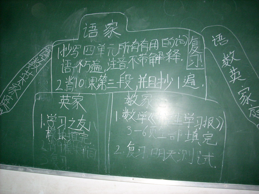 教室前面的黑板是供老师写字用的,下课以后,也成了许多同学展示自己的小舞台了。有时,一些同学在黑板上大写一通;各科课代表,每天都要将老师布置的家庭作业写在上面。久而久之,它们搞起了组合,将各科"作业"有机地写在一起好似一副不错的漫画。
