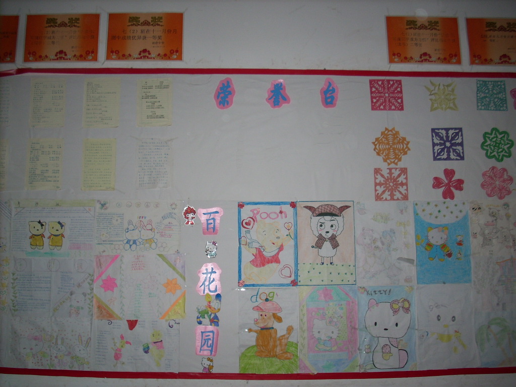 在教室的后面是一堵雪白的墙,学校要求每个班都要利用它办专栏,展示同学们的才艺。每个班各有特色,都是由学生自己设计办出来的,只是一些字,我们请老师帮忙在电脑里打出来的,里面的内容都是我们自己设计出来的。 我们班的女同学多,她们的手儿巧,用各色彩纸剪出各种美丽的图案。在专栏的上部,贴了好多的奖状,是我们班全体学生努力的结果。