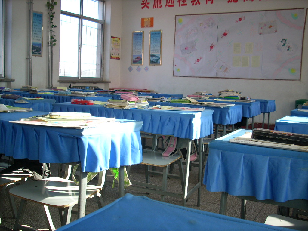 2007年,我们搬进了新教学楼。所有的班级都是同样的宽敞明亮的教室。教室里还配备了新的课桌和椅子,又轻巧又美观,不像以前在旧平房的教室里,所用的都是笨拙的木桌和木凳。好多的桌子上有洞和刻痕,写字的时候还要衬上一本书才能写。现在的课桌光滑平整,不用任何衬物就可以写字。为了保护这些新课桌,学校还专门定制了桌套。我们所做的就是每月带回家洗一洗。