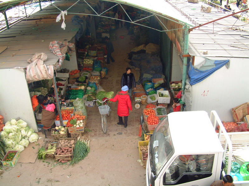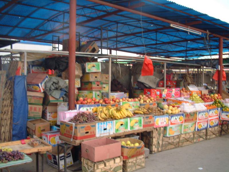 进入商城,放眼望去,其规模在这样一个小城镇可算是够大的。最中间的是菜市场,要进入商城,这里是必经之处。大菜棚下被分割成若干个小房子,里面全是新鲜的蔬菜。如果你需要什么菜就可以挑选。穿过菜棚,迎面而来的是水果的香味,原来到卖水果的地方了,摊主们早已把自己的水果擦洗干净,并整齐的摆放在自己的摊位上,等待顾客的选取,有西瓜、桃子、香蕉等等。