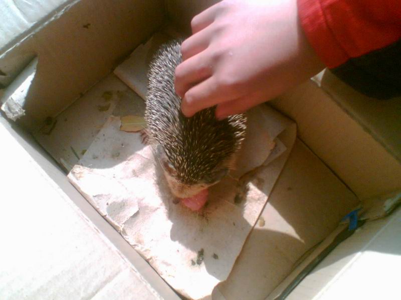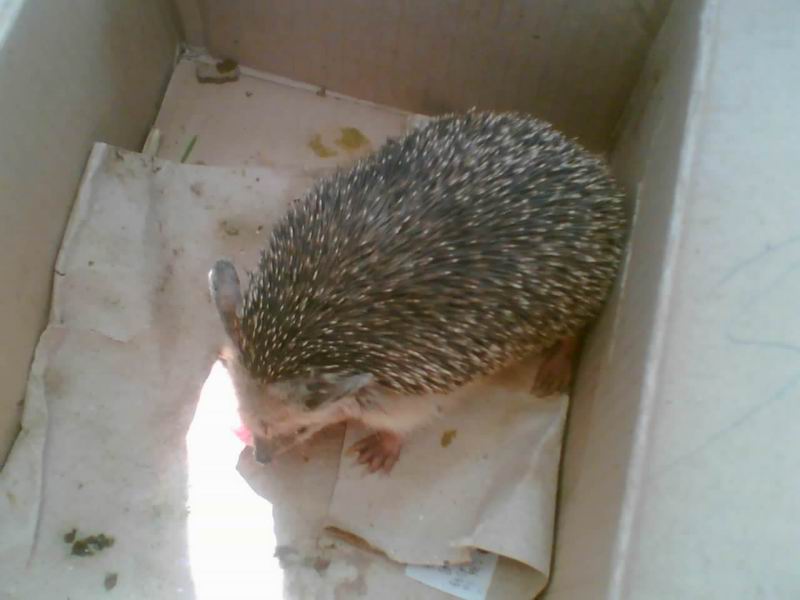 有个过路人觉得稀奇,弄了块大肉扔给小刺猬,哈哈,不到1分钟,这个小家伙便狼吞虎咽完了,急急地抬起尖尖的嘴鼻,细长的胡顺一颤一颤的,细细一看,这家伙鼻子上还是一点红,蛮可爱的。我想买下来,可是我钱没带够,又不忍心和小孩商价,便放弃了。