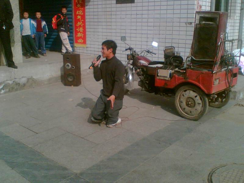 没成想一忽儿又见着了个街头卖艺的双腿有残疾的人,他的歌声哄亮有力,动作手势恰到好处,还真有些大歌星的风范。我站着听了一首《爱拼才会赢》觉得挺受感动的。对了,他身后的三轮摩托车里放的是一套很破的功放,功放供电还是汽车电池。唉,这也算是一种创新的艺术啊。