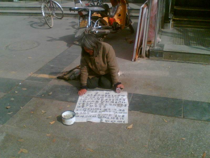 在一家商场的门侧,我发现了这位老人。我站了几分钟,细细看了看这位乞讨的老人的求助信,说是她家儿子自小年走失,遍寻多年未果,现无路费归家……无论是真是假,权当献献爱心吧,我走上前给了老奶奶一元钱。